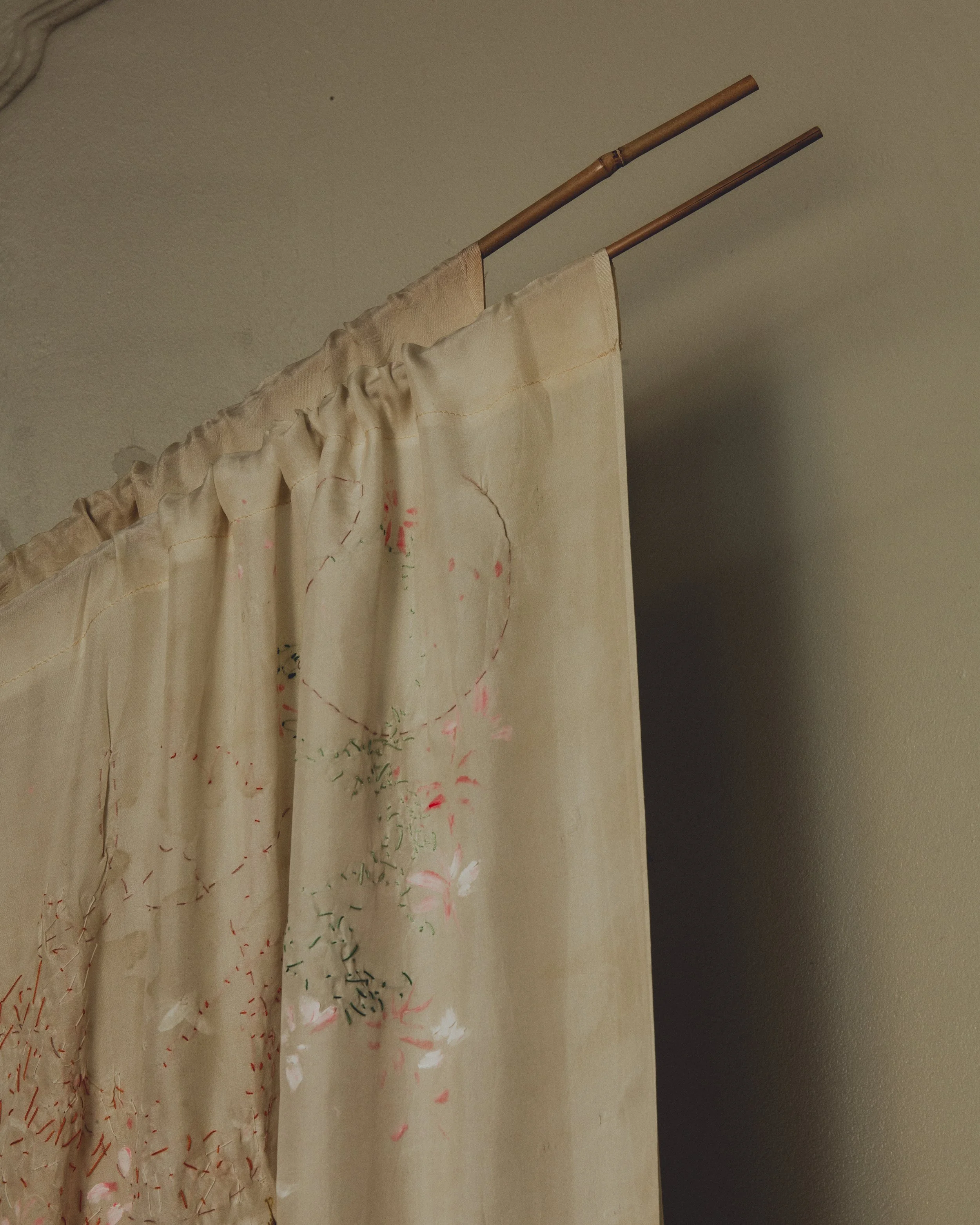 Emma Cassi Art combina bordado, tintes naturales y materiales vintage en una obra textil poética. Criada en la campiña francesa y con experiencia en joyería y estilismo en Londres, hoy vive en Madrid. Su práctica une naturaleza, memoria y legado cultural, invitando a recuperar el gesto manual como experiencia sensorial y meditativa.